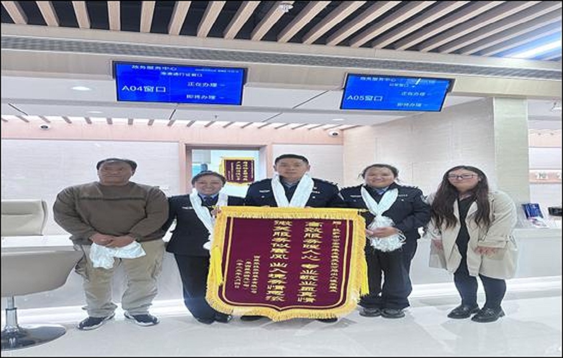 近日,西藏旅投旅游服务有限公司负责人一行专程来到拉萨市公安局堆龙德庆分局出入境受理点,将一面印有“高效服务暖人心、专业敬业显真情、微笑服务似春风、出入境务情意浓”的锦旗亲手交到窗口民警手中,对窗口为旅行社团队旅客提供的便捷办证服务表示衷心感谢。