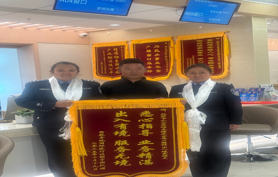 近日,西藏圣地国际旅行社将写有“悉心指导、业务精湛、出入有境、服务无境”的锦旗送至拉萨市公安局堆龙德庆分局政务服务大厅公安窗口,对窗口工作人员专业高效、耐心细致的服务表达诚挚感谢,生动诠释了“出入有境,服务无境”的工作理念。